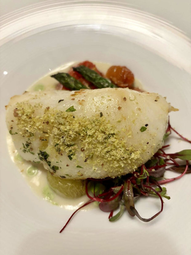 - Pan Seared Chilean Bass – a nice slow poached seabass with a white truffle vichyssoise, shaved pistachios and a celery and dill crema.