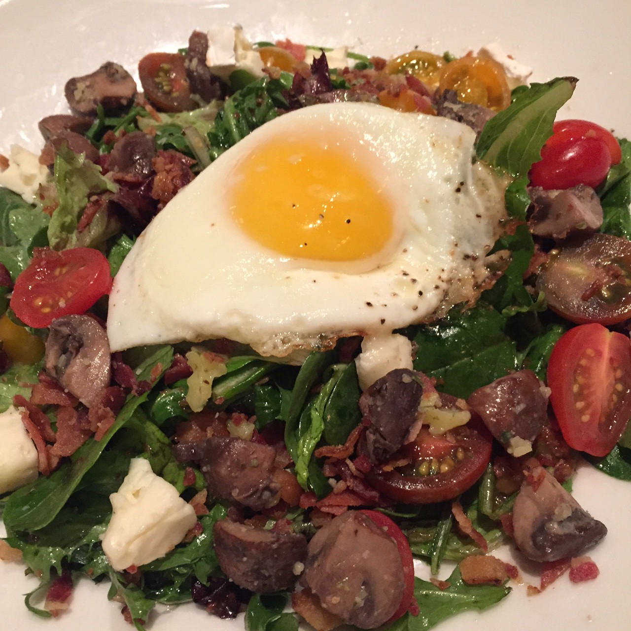 Farmhouse Frisée Salad — Fresh greens tossed in warm bacon vinaigrette and topped with tomatoes, bacon, brie cheese, sautéed crimini mushrooms and a fried egg.