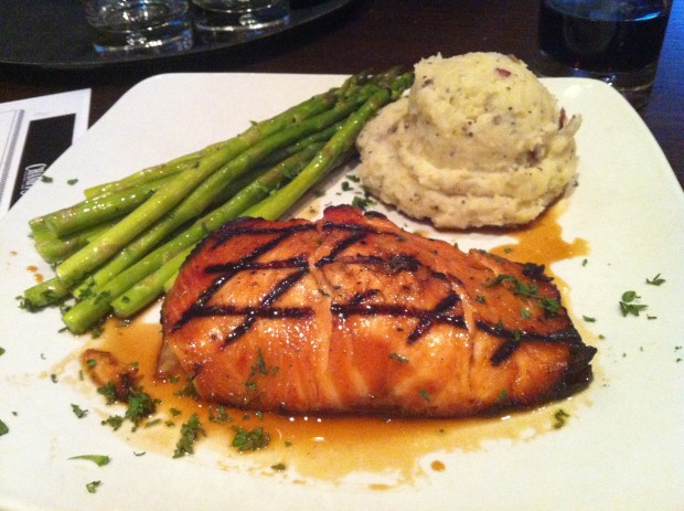 For the main course, I opted for the grilled salmon served with a bourbon sauce, garlic mashed potatoes and seasoned vegetables. Other options included a kung pao chicken, baby back ribs, roasted artichoke and grilled chicken penne, vodka chicken farfalle or your choice of premium hand cut steaks. Taking a peak down the table, it looked like everyone had ordered the red meat.