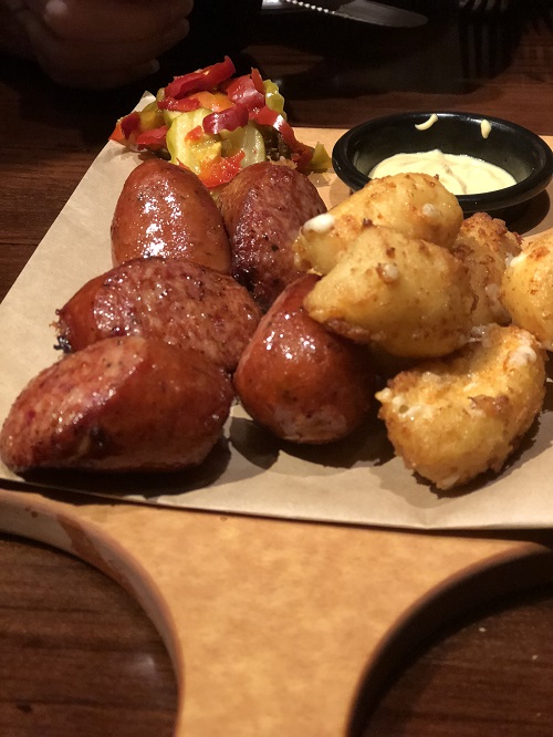Longhorn Steakhouse has done several things to create a unique dining experience at their Plano outpost “ and they really pay off. We started off with the Longhorn Butcher Block, an appetizer featuring unique tastes of Texas. The generous platter included grilled sausage bites from Slovaceks in Snook, TX paired with fried Oaxaca cheese from Montgomery County, TX all paired with pickles and a spicy mustard. Nothing about this dish was throwaway. The sausage was meaty and peppery with lots of flavor, and the fried cheese, which I feared would taste like cheese sticks from the 1980s instead were reminiscent of regional cheese curds gently fried in a very light batter. The mustard was the perfect complement for the sausage, and the pickles added the perfect tang!