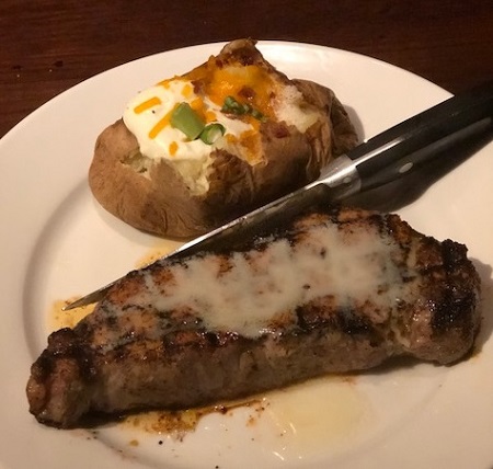 Of course, the steaks were the real test, and we ordered two. The New York strip was a reasonable 12 oz. portion, and cooked to order a perfect rare.