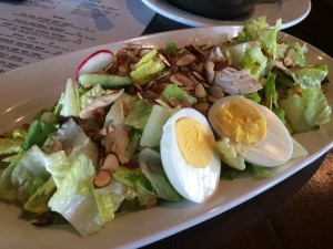 I was good and chose the latter; I opted for the Farmer’s Chicken Salad, topped with the restaurant’s famous pulled rotisserie chicken, almonds, bacon, Vital Farms eggs and a honey mustard vinegarette.