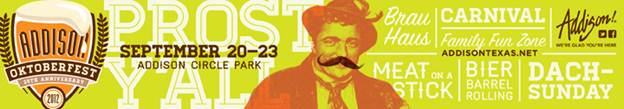 Named one of the countrys most authentic Oktoberfest celebrations by Forbes and USA Today, Addison Oktoberfest features four days of family-oriented entertainment. German entertainers in authentic costumes perform traditional Bavarian folk dances, schuhplattling, oompah music, sing-a-longs, yodels and more. A special Oktoberfest Spaten Bier is served along with several types of German sausage, sauerkraut, strudel, giant pretzels and more. There are carnival rides, midway games, childrens entertainment and activities and a 5K run and 1 mile fun run benefiting Wipe Out Kids Cancer. Guests can register to dine at the Brau Haus for a full service dining experience featuring an exclusive menu at www.addisontexas.net. Brau Haus seatings are $45 and includes Oktoberfest admission.