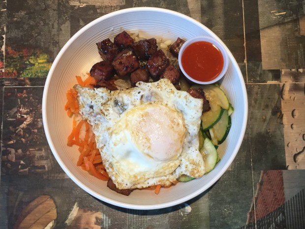 New Bi Bim Bop or Korean Rice Bowl options include a Vegan Veggie Bop (with garden veggies and Braggs Amino) and the For Realz Bop with Short Rib Steak. I tried the For Realz Bop with the over medium egg and Seoul Fire Sauce and it didnt disappoint. The short rib steak was tender but not chewy and the yolk from the egg made the bowl creamy once everything was mixed together.