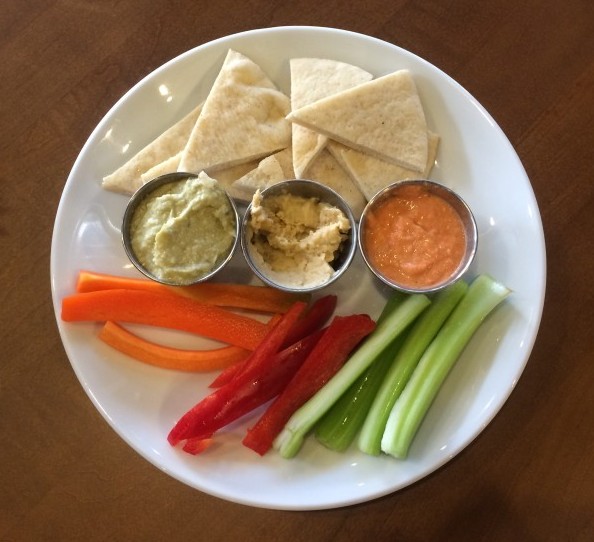 If happiness on a stick is not quite what you’re looking for, you can also try the healthier shareable options including a trio of hummus ” avocado, roasted garlic, and roasted red pepper ” served with fresh veggie sticks and pita bread.