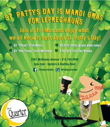One of Dallas’ biggest celebrations kicks off this weekend with the Greenville Avenue St. Patrick’s Day Parade. We’ve rounded up some of the best specials and events around the city to help you make the most out of the luckiest of holidays.