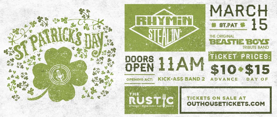The Rustic is having its St. Patrick’s Day party after the parade this Saturday with live music from Rhymin’ N Stealin’, the original Beastie Boys tribute band, and 90’s cover band Kick-ASS 2. Tickets are $10 in advance, $15 at the door.