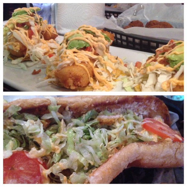 - The fish tacos, which can be ordered fried or blackened, were equally good and equally generous. Almost too large to pick up, each held a large fillet and a big slice of fresh avocado along with cabbage, pico and a spicy special sauce.