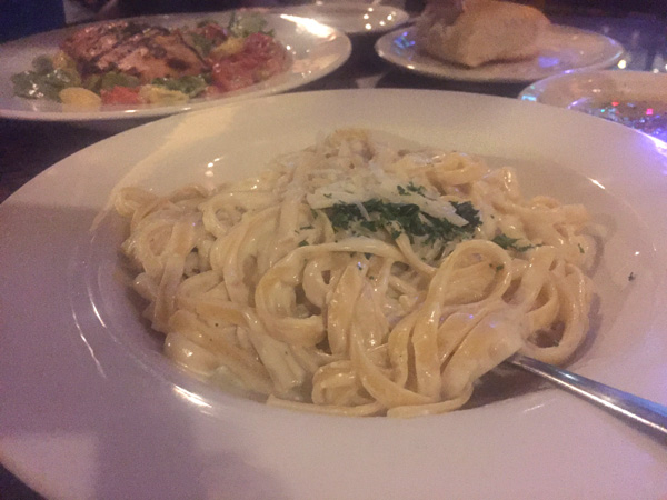 After walking 6+ miles playing tourist around San Antonio, I was in much need of carbs. Foursquare recommended Paesanos as a great place for pasta. The wait was longer that I’d normally go for, but Saturday night on the Riverwalk was beyond busy. It was also apparently prom weekend, as there were several gals in seriously fancy dresses. I had Fettucini Alfredo, not the best food photoing but it tasted sooo good! Rory’s dish was a colorful tortellini served with basil pesto and grilled chicken.