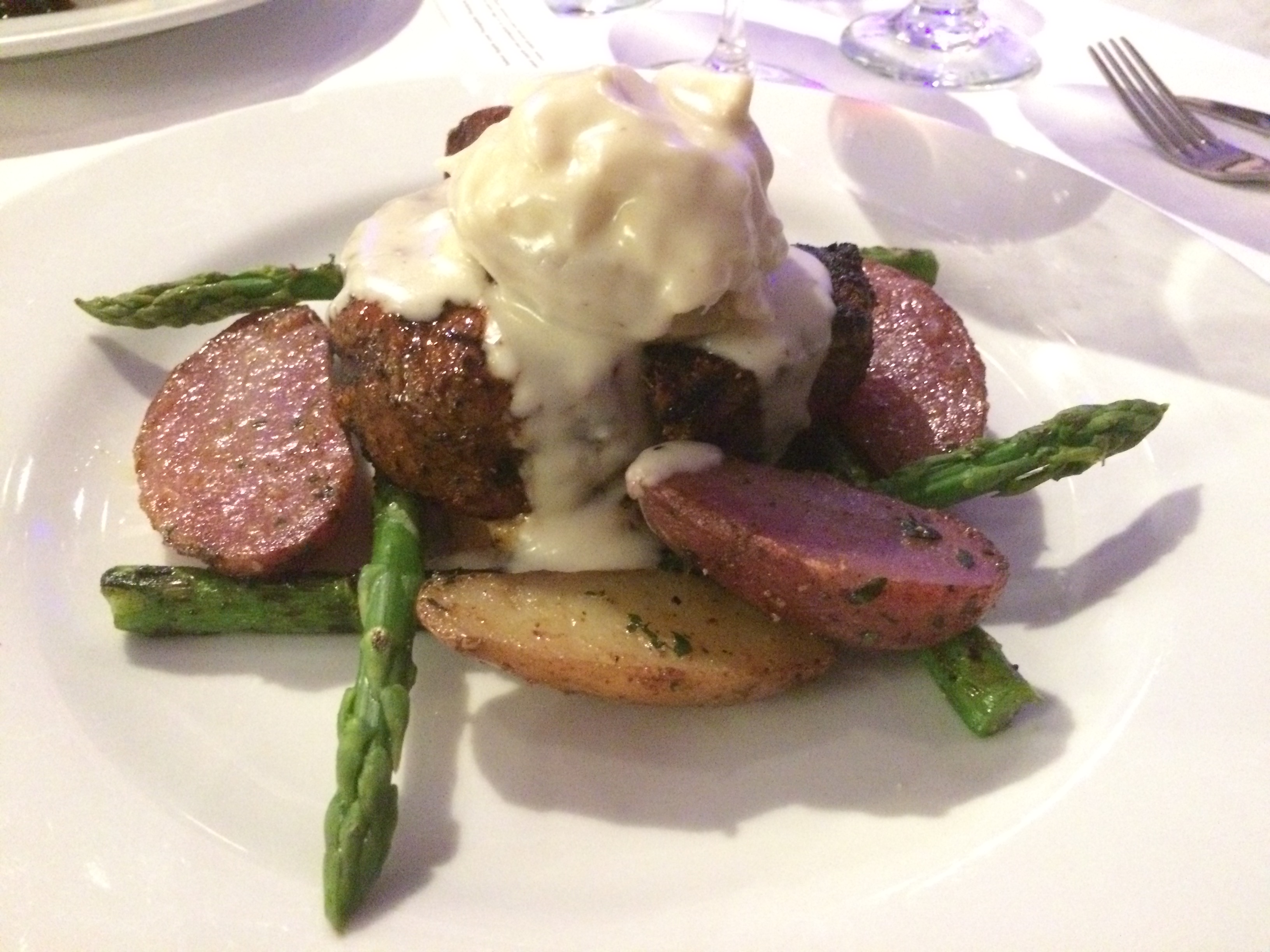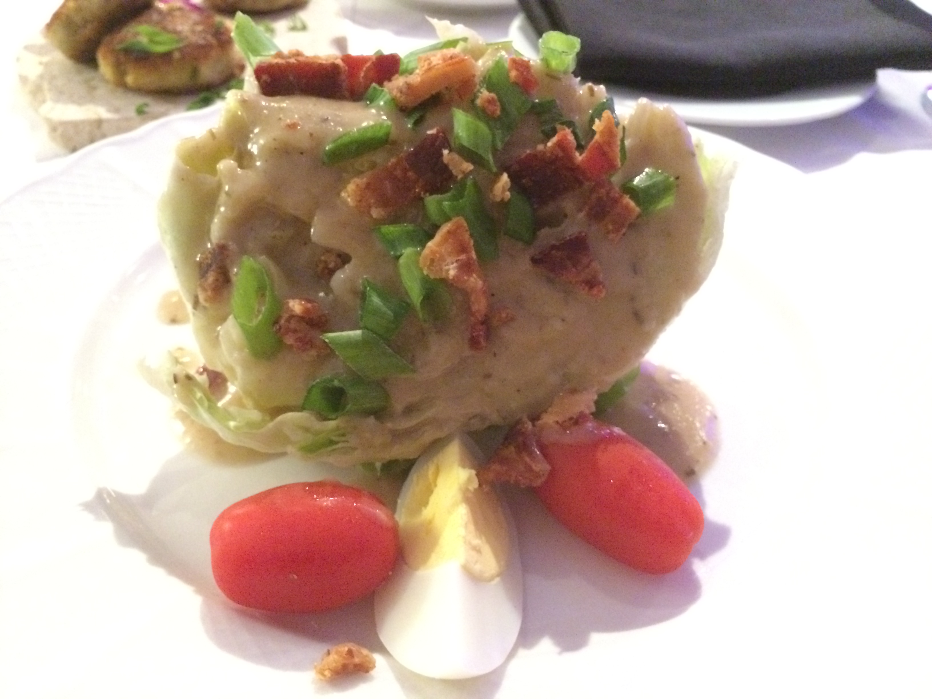 When you dine at Eclair Bistro get ready to spend some time at the restaurant because nothing is cooked until you order it. Trust me, this is a good thing. We started our dinner with a wedge salad and New Orleans-style crab cakes. I’m a fan of wedge salads. They are crisp, tangy, bright, crunchy, a whole host of textures and flavors to bring a chunk of nutrition-free iceberg lettuce to life. This salad was topped with real apple wood bacon, grape tomatoes, boiled egg quarters, green onion and a blue cheese dressing. Hello, vegetables!