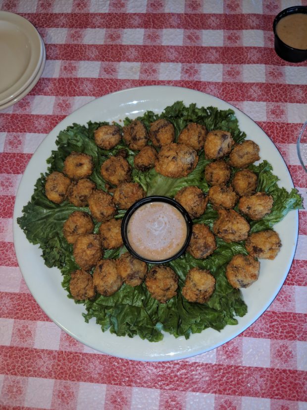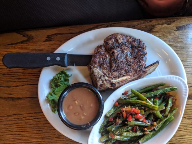 The bone-in filet was served with green beans topped with onions and peppers plus a side of beans. The green beans alone are worth a visit, but the filet delivered with flavor.