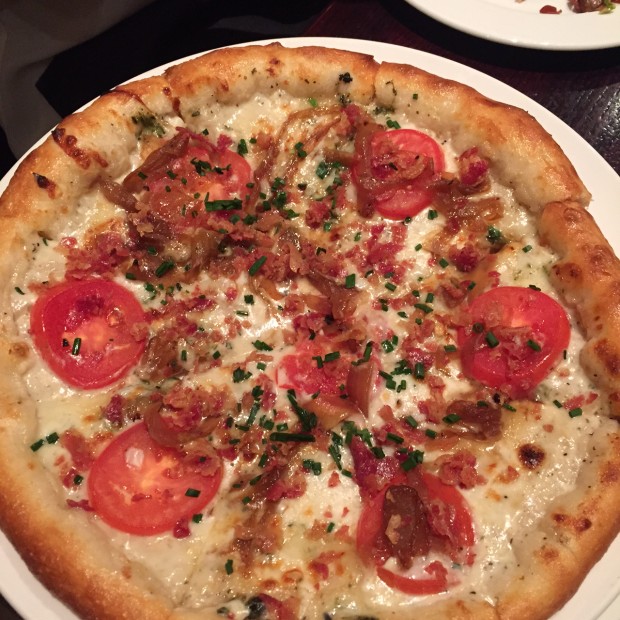 Gruyère Pancetta Pizza “ Crispy pancetta, caramelized onions, roma tomatoes and fresh chives with a gruyère and mozzarella cheese blend over a creamy herb white sauce.