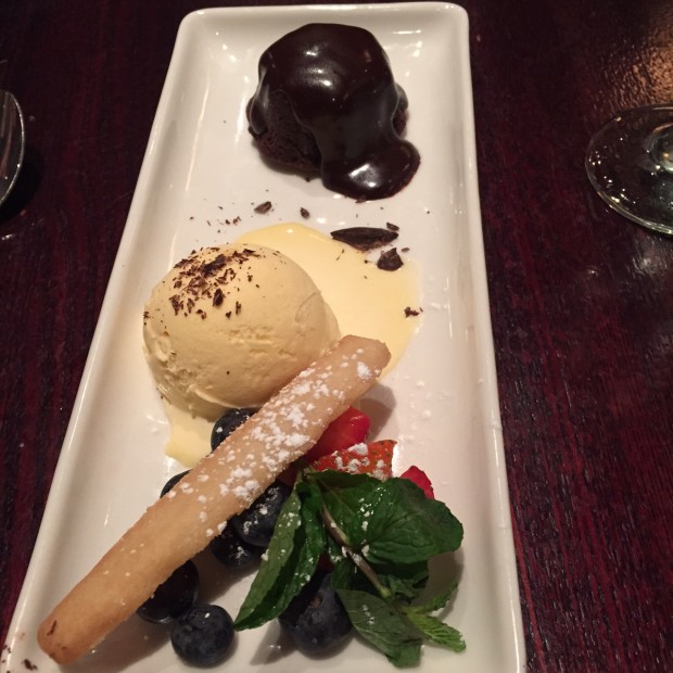 Chocolate Budino Cake “ Italian chocolate pudding cake smothered with warm fudge sauce and a dollop of vanilla ice cream. Served with fresh strawberries and blueberries and a housemade short bread cookie, dusted with powdered sugar.