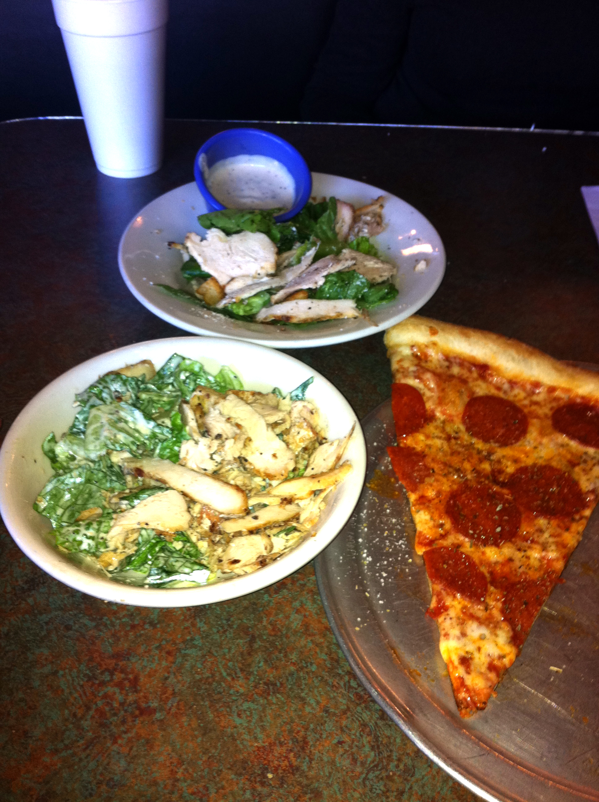 I loved the pizza so much that I rarely ever got anything else, a slice (or 2) of pepperoni or sometimes I would totally shake things up and get plain cheese. Well, one day I was actually tired of eating pizza¦.yeah, I know, I couldnt believe it either! I ordered a chicken Caesar salad. Now I had eaten this dish at many places, but this thing really tasted phenomenal. This is one of those dishes that doesnt look like it would be anything special. Even when I was thinking about how to describe it on DFN, it didnt sound very special or blogable. I assure you that the sum of its parts add up to an awesome lunch!!!