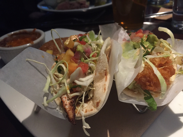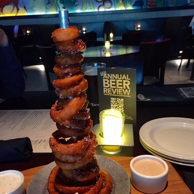 You’ll find typical bar foods on the happy hour and regular menus but with a twist, like the tall tower of onion rings and the Hawaiian Poke Stack (crispy ahi tuna tacos). Both equally delicious.
