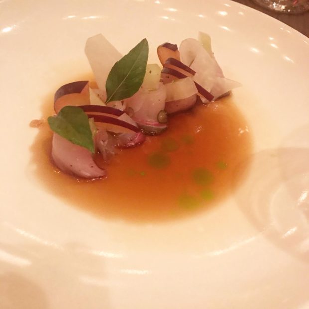 – Kanpachi crudo, ginger nikiri, burnt negi oil, lotus root