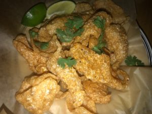 My adventure began with three great appetizers and an awesome drink. The pork rinds were seasoned
