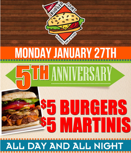 In honor of their fifth anniversary, Kennys Burger Joint will offer guests $5 Burgers and Martinis for any burger or martini on their menu all day on Monday, January 27. Normally, burgers on the menu range from $6.49 – $8.99 and martinis are $8-10. The restaurant is known for its martini menu, and like all of Kennys establishments, features Gray Goose on tap at 28 degrees.