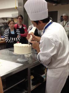 We took a break which is when I ran to the Cake/Cupcake Decorating class that was already in session. The chef was busy showing everyone, including students who were there for their school credit, how best to smooth out the icing on your cake. Hint: use a generous amount of icing on top of the cake, hold the spatula to an angle to the cake with the tip at the center, and rotate the turntable. Excess icing will drop down the side and you can hold the spatula at 45 degree angle to the cake’s side, and again turn the turntable. With a clean spatula, smooth the raised icing on the edge of the cake. I got a chance to play around with various piping tips and learned from a student that she’ll just use powdered sugar and shortening to make practice icing.