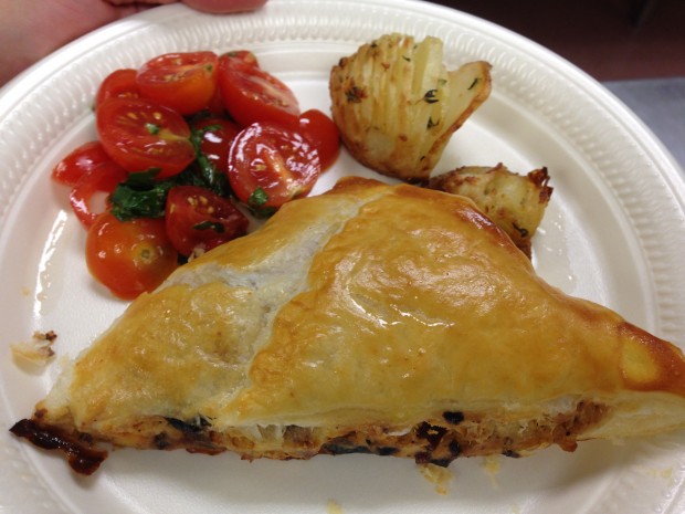 Back in the brunch class we put our tart filling into puff pastry and cut them into triangles, baked off some hasselback potatoes and sliced and baked our scones. While everything was baking we made a quick kale salad with a tahini dressing which was a pleasant surprise. I would have never thought to use tahini in a dressing, but it was delicious and a recipe I’ll be keeping handy. We also blended up a quick Five Fruit Juice Smoothie while we enjoyed our nice hot scones and tarts. We ended by grilling some fresh pineapple slices and serving them with vanilla ice cream and crushed amaretti cookies. So much good food!
