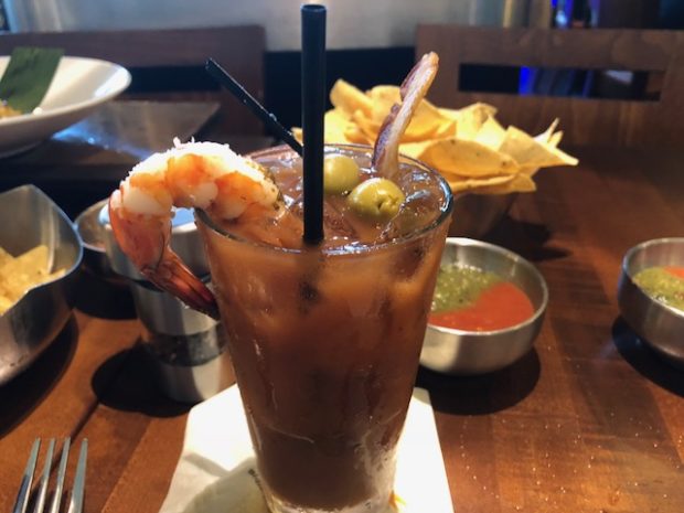 My visit was during the weekend, so YAY for brunch. Right away I ordered signature Bloody Mary made with Tito’s vodka and topped with olives, a strip of bacon and a jumbo cocktail shrimp. Fun fact – you can also order the Bloody Maria made with El Mayor Tequila Blanco!
