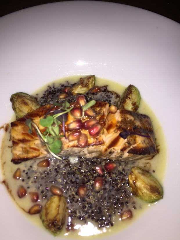 - Salmon: For a light entree option, try the grilled chipotle-honey salmon. The dish comes with charred brussel sprouts, black quinoa, beurre monte and pomegranate reduction.