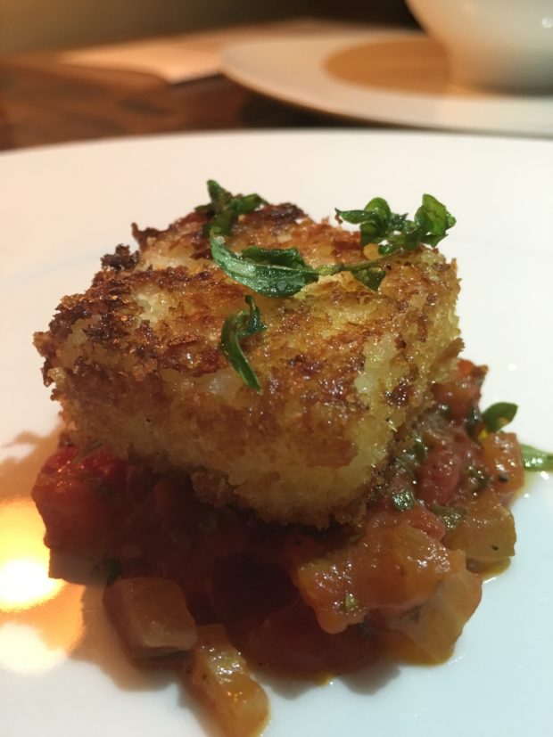 We continued with the crispy anson mills grit cake served on a bed of tomato fennel relish. This might have been my favorite item of the evening. I absolutely love the versatility of grits, and Im even more in awe of how chefs elevate the grainy ingredient into a sophisticated entrée.