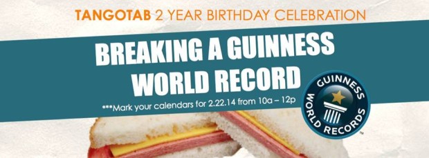Two years and more than 250,000 meals later, Dallas-based food deal app TANGO TAB is celebrating its second anniversary on 2/22 in a BIG WAY! TangoTab, joined by LaDainian Tomlinson, Mike Modano and your help, will attempt to break the Guinness World Record for the most number of people making sandwiches simultaneously this Saturday, Feb. 22, from 10 a.m. to 1 p.m., at the Hilton Anatole Dallas.