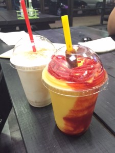 Guests can choose from water, soda, fruit drinks and bottled beer to enjoy with their tacos. Additionally, I highly recommend getting one of the housemade slushies.The Horchata (back slushie, below) reminds me of a Chai tea latte and a sweet dessert drink. The sweetness comes from the almond milk, and the drink is topped with cinnamon spice. The iced Mangonada drink comes with red sugar-coated candy stripes and tasted like mango with a bit of a spicy kick to it. Both were refreshing, but I enjoyed the Horchata the most!