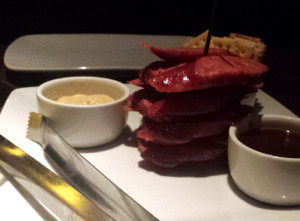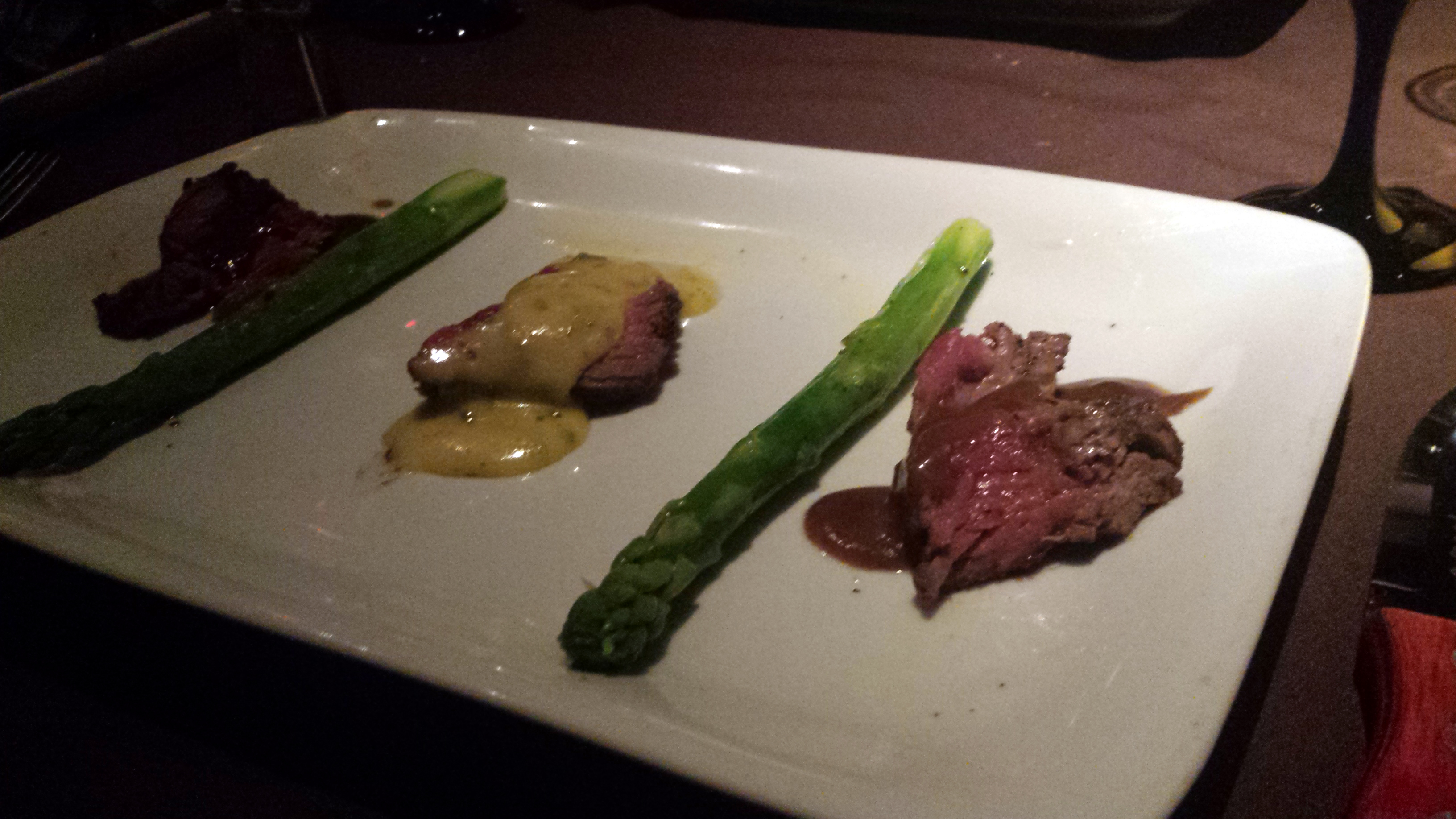 Please don™t ask me to pronounce this. I™m really excited it seems I spelled it correctly. But do feel free to ask me to eat it again. It was explained to me that this is a special cut of beef “ there are only two of these cuts in each animal. They topped it with, from left to right, a demi-glace, pear béarnaise and peppercorn reduction sauce. These represent Perry’s signature sauce selections available as accompaniments for their meats.
