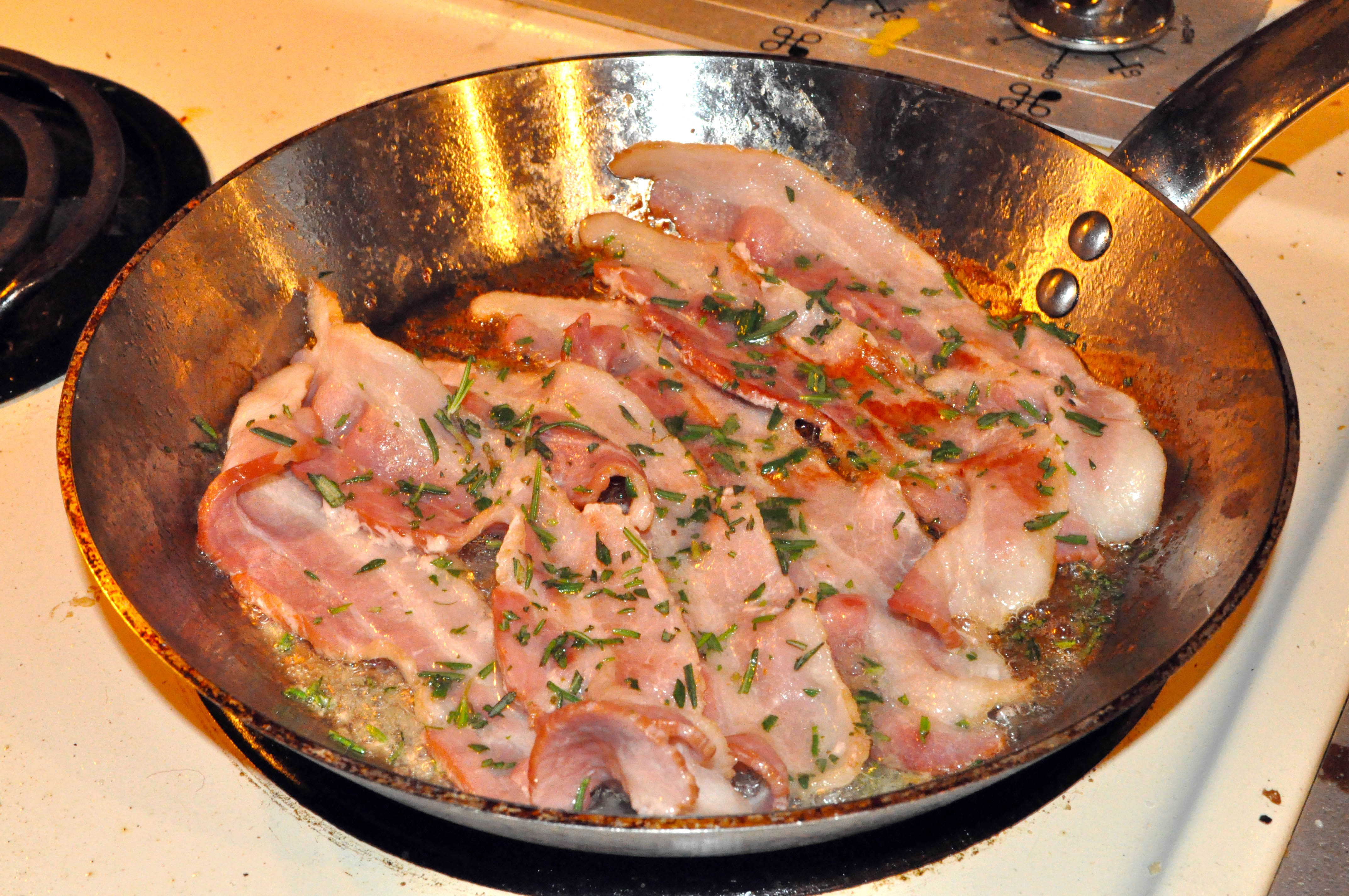 Next step is to fry up some bacon, recipe calls to place it on the chicken as it cooks, but I like to fry it with rosemary and add it to the dressing. The dressing consists of lemon juice, anchovies, garlic, grated parmesan cheese, olive oil and sour cream.