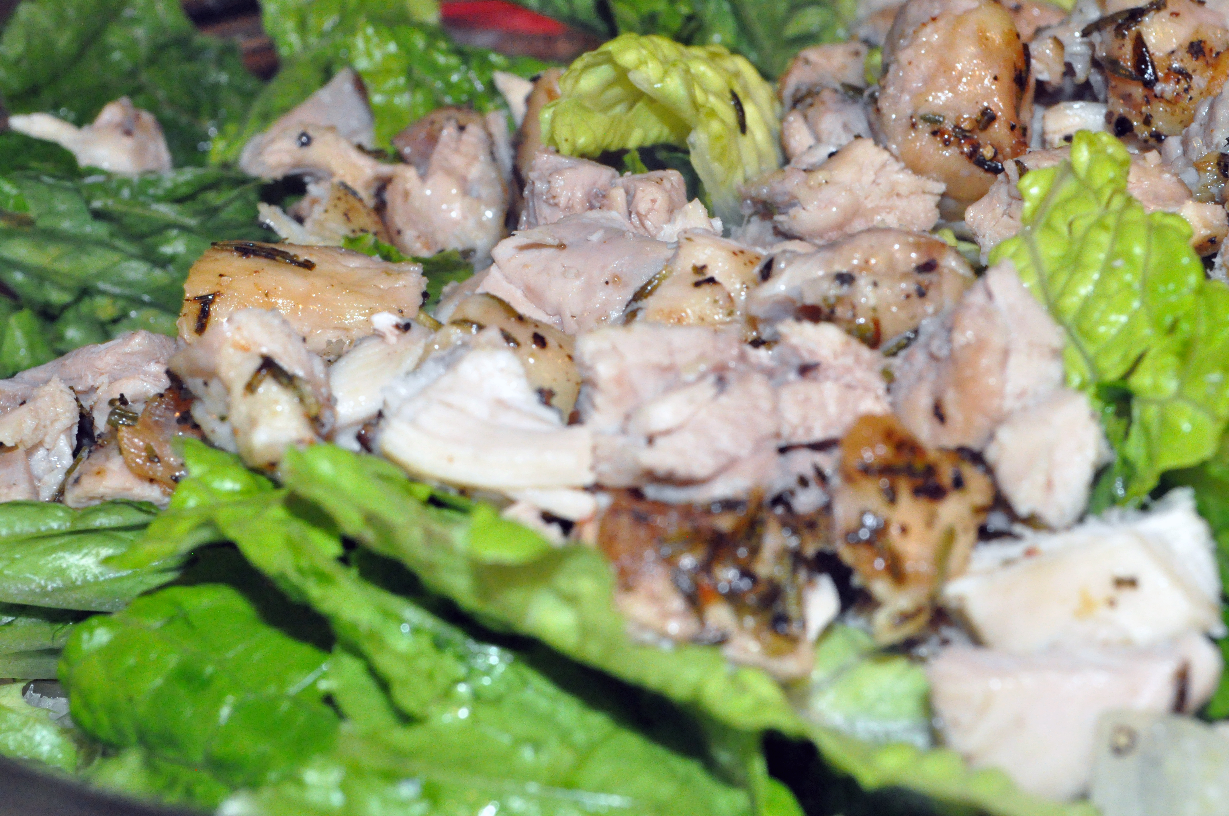 Once the chicken is done, shred or rustic cut it and place it on top of your romaine.