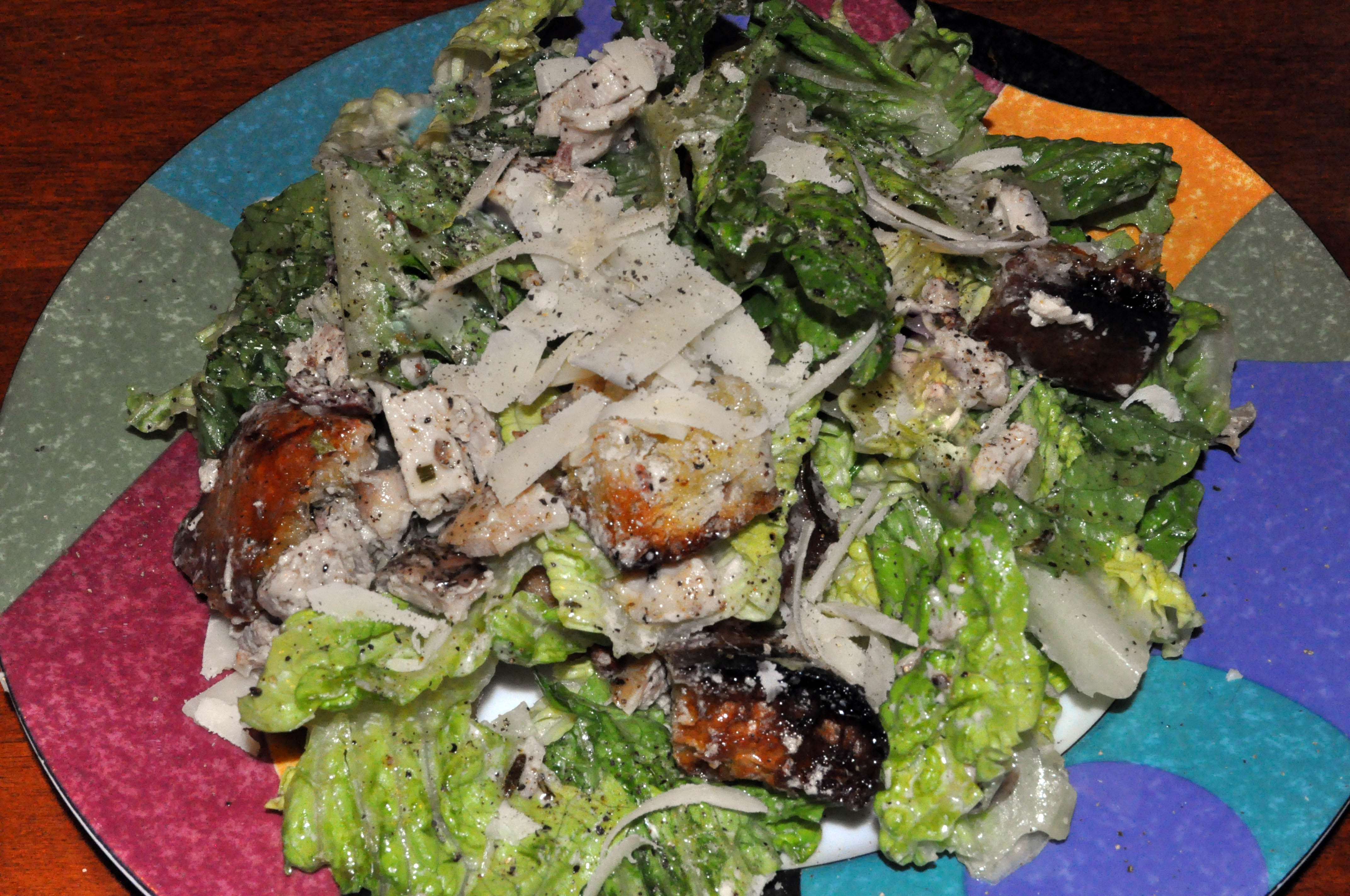 This is turning into my favorite meal. As you may have read in a previous post, I like chicken caesar salads. The best recipe I’ve found so far is Jamie Oliver’s Proper Chicken Caesar, from his “At home with…” cookbook. Probably the most unique aspect is that you bake the chicken as it lays on top of crusty bread chunks, so that the juices, olive oil and rosemary flavor the croutons to perfection.