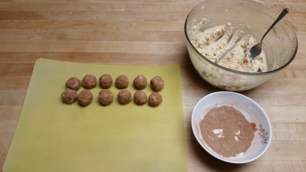 The dough will probably be very sticky, but it’s much easier to roll into balls when it’s cool. So chill the bowl of dough in the fridge for 20-30 minutes. Just before you take your dough out of the fridge, start preheating your oven to 350°F.
