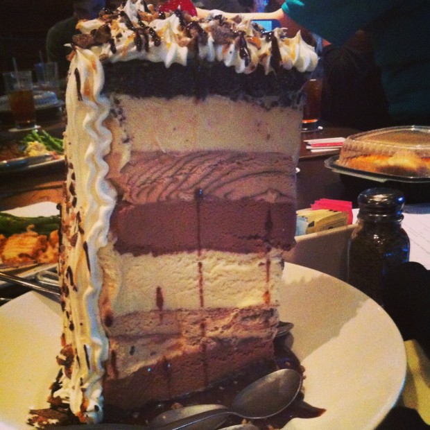 That, my friends, is what they called the Dessert Sampler. The tower of deliciousness better known as the Mile-High-Seven-Layer-Cake immediately stole the show. Queue the iPhone photos. It was literally seven layers of ice creams sandwiched in between two layers of brownie, topped off with whipped cream and cherry.