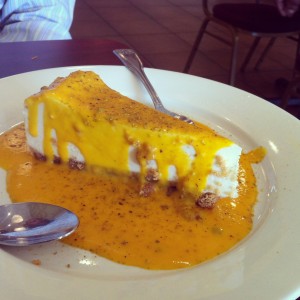 Now, back to the meal finale, dessert. I’m now 0 for 3 as the owner brings out mango cheesecake. My lunch companion came off his guacamole high when he saw this slice of heaven in front of him. The mango sauce was fresh, not too sweet and paired well with the teaspoon of cheesecake I sampled.