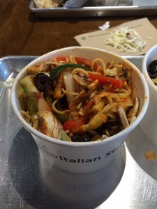 Like many other eateries in Addison, a reasonably-priced lunch pair is available for those, like me, who are a little indecisive, a Half & Half Combo. I decided to go with the small pasta with a side salad. As we made our way through the line, my associates enjoyed the opportunity to top their PaDeene with an assortment of options. They even said oh, its like Chipotle. *face palm* The fact that it resembles a tortilla didnt help this statement either.