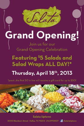 The Salata Uptown store will be located at 3000 Blackburn Street, suite 150, Dallas, Texas, 75204 and will officially open on April 18th 2013 at 11:00 a.m. with regular hours commencing on April 19th.