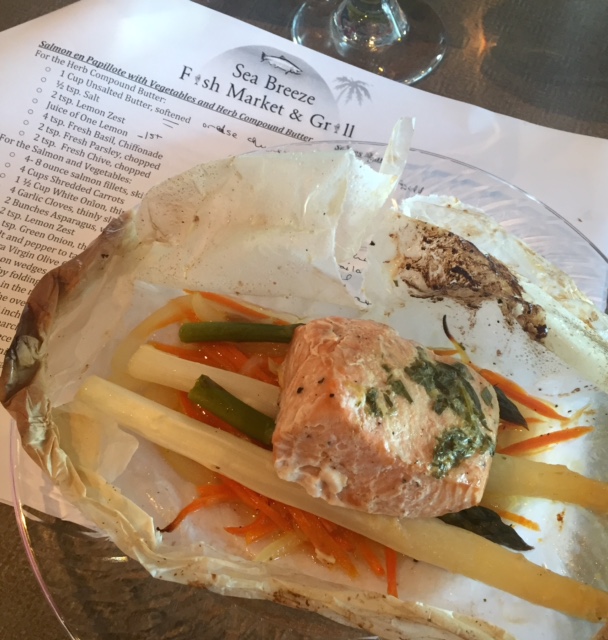 Also, not only did they show us how to make a succulent salmon over veggies baked in a pretty package with herb compound butter, but we received a gift of the flavorful butter to try the recipe at home.