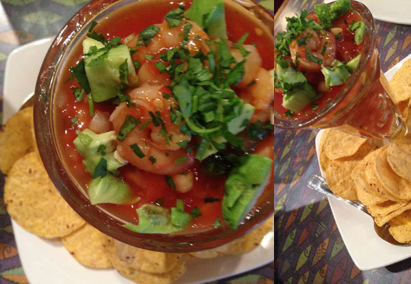 Raphaels Mexican Shrimp Cocktail: Shrimp, tomatoes, avocado, jicama and onions in a spicy cocktail sauce and served with tortilla chips
