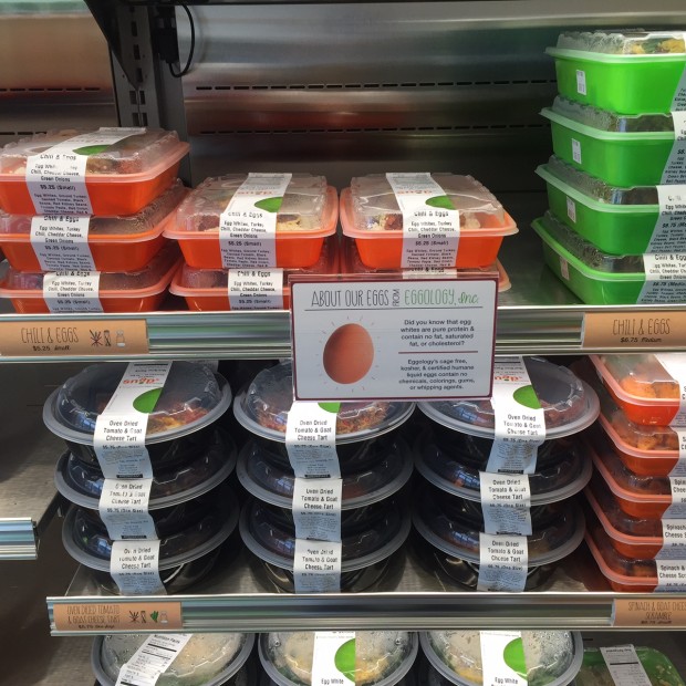 Shoppers can choose from a variety of juices, along with meals that have colored-coded packaging: green (the smallest box with the lowest amount of calories), orange (medium-sized box) and black (the largest box – ideal for those who like to consumer a lot of calories every day (all that lifting, probably) and it makes for a nice family-style meal). All the meals have a shelf life of about three to five days. The juices are made daily, and all items close to expiration (yet still good) are donated to a local food shelter.