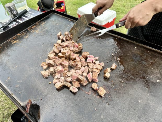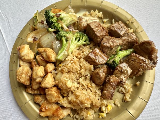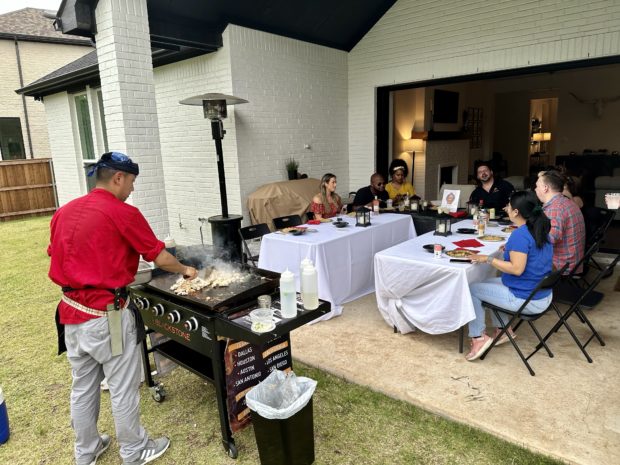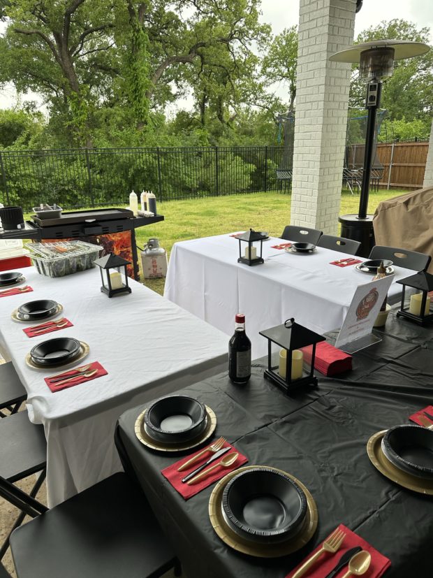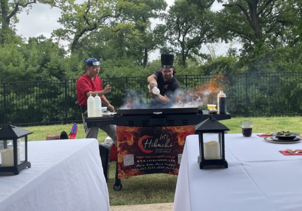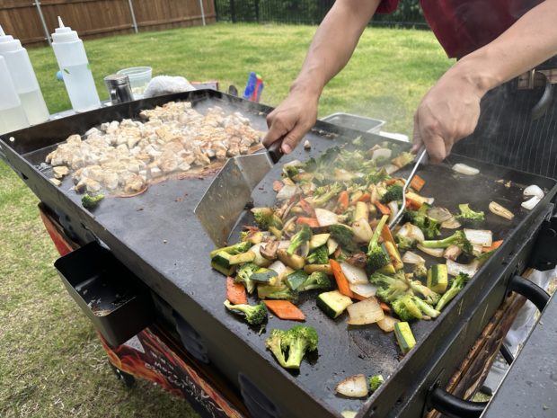 Several of us from Dallas Food Nerd got together for Sunday Funday, and Let’s Hibachi hosted our backyard party with traditional hibachi grub. Let’s Hibachi brings the main equipment and whips up the food in the comfort of your home or backyard. (If hosting the party inside your house, be sure to be in a room with high ceilings and open windows.) The chef will also stir up some fun like they do in the restaurants, like playing with the ingredients (like egg toss in the chef’s hat) and spraying sake in your mouth!