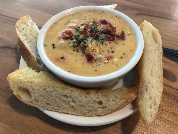 Roasted Corn + Shrimp: roasted and spiced corn, Neuske’s bacon, shrimp, cracked pepper, herbs
