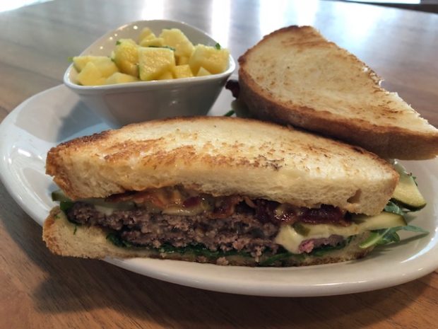 Sidewalk Patty Melt: classic thin patties, Seagrams white American cheese, Neuske’s bacon, arugula, pickles, house 1000 isle sauce. If you’re all about a meaty sandwich, order this one! It takes your average Patty Melt to a whole new level, and isn’t greasy like the versions from fast-food chains. Tip: Pair the melt with the new seasonal fruit cup (pineapple and mint) – you will be surprised at the perfect balance of the two flavors!