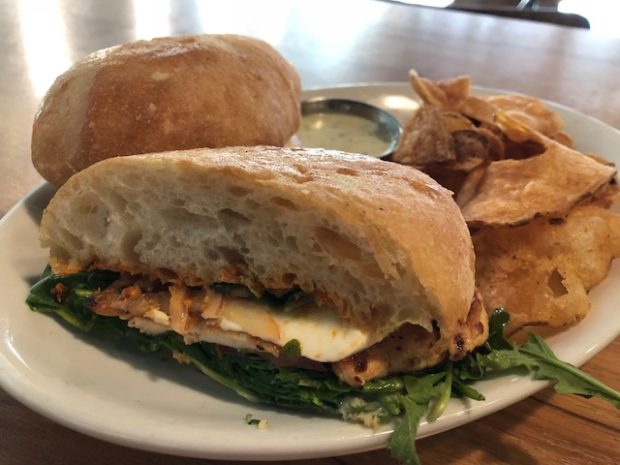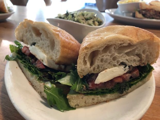And, the Lemon Caprese: thick Roma tomato, mozzarella, fresh basil, arugula, balsamic glaze drizzle, house lemon mayo) — pictured above. Tip: Add a cup of the new seasonal potato salad.