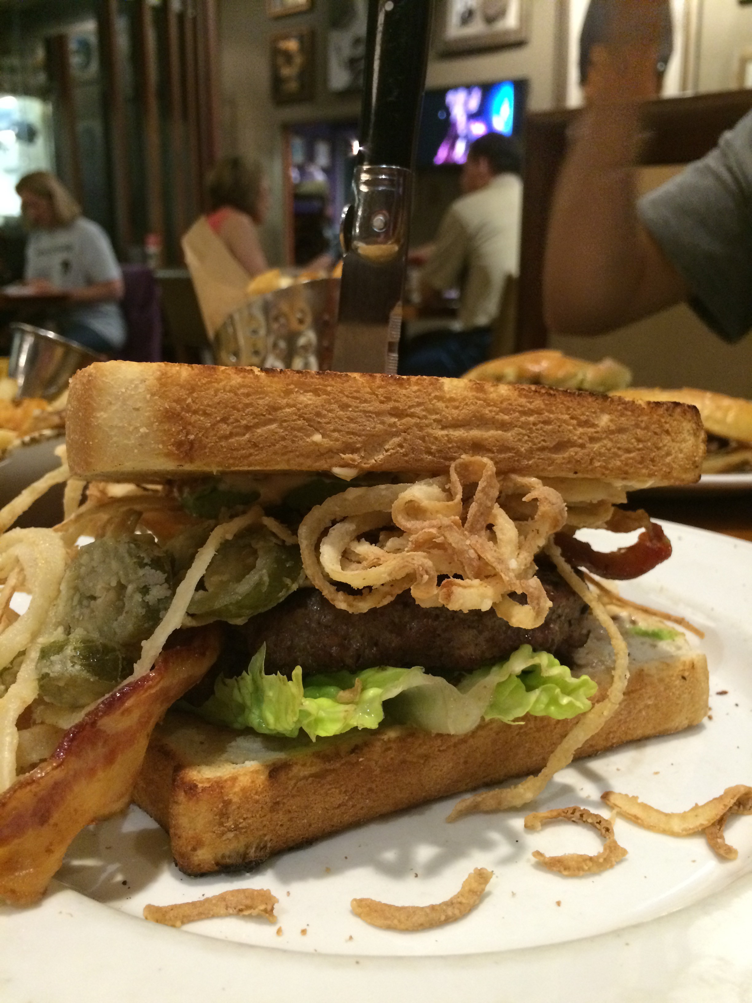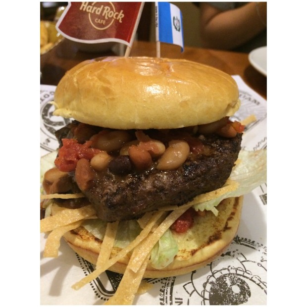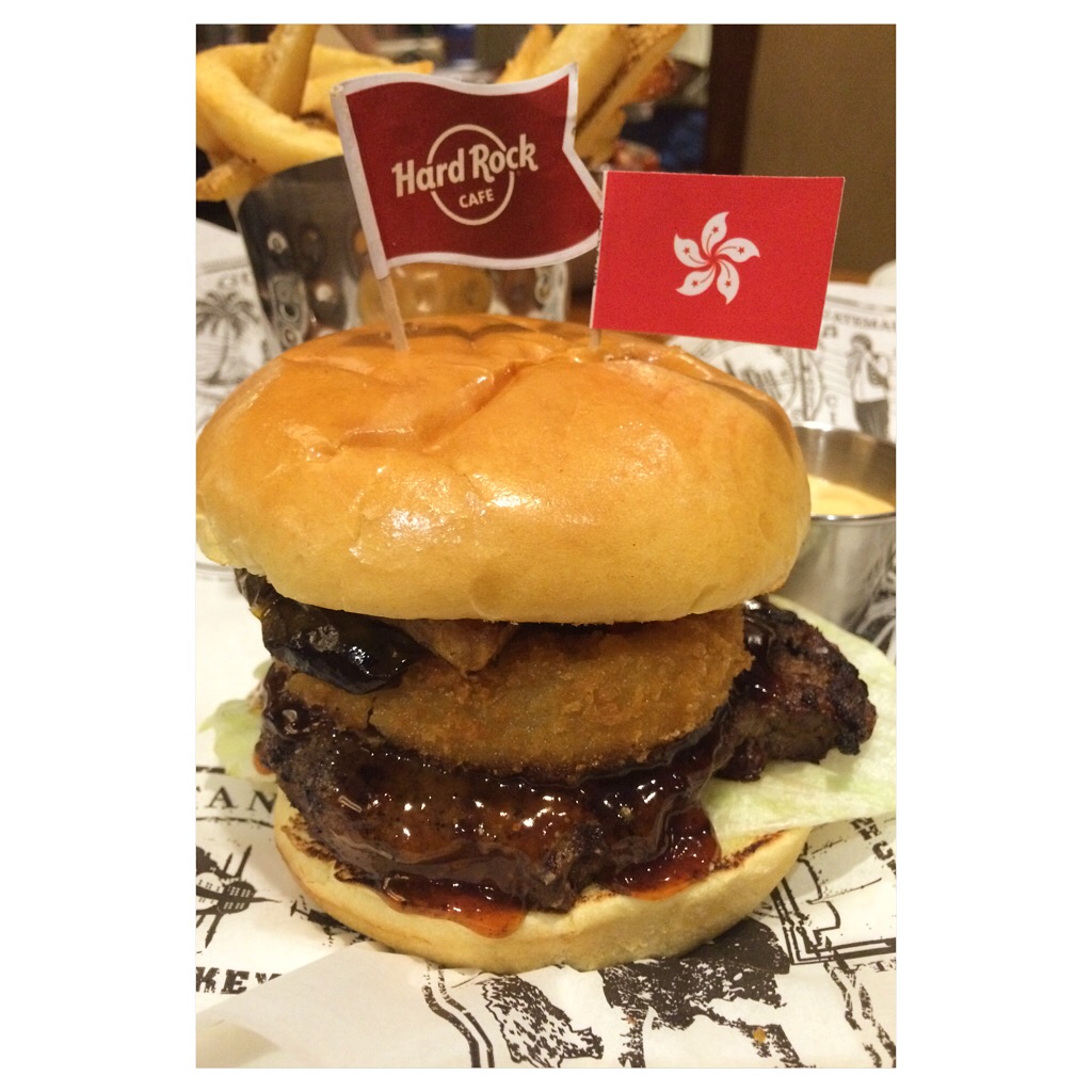 For our next sample, we had to cross the International Date Line and venture to the east for the Sweet & Sour Burger in Hong Kong. The manager stated this was the favorite amongst the servers. I can see why. This burger is topped with grilled pineapple, a huge onion ring, bell peppers and then drizzled with a house-made sweet and source. Sweet. Smoky. Savory. Yes. I dont think Ive ever eaten an Asian-inspired hamburger before this moment, but I am glad I did.
