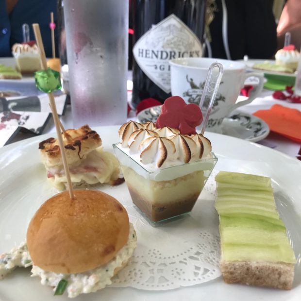 Each cup of tea had a cute quote attached. Alice Tea consists of Pomegranate infused Hendricks gin, lemon, hibiscus, and topped off was a special rose petal-lychee foam. I am a lover of lemon and hibiscus so topping it with rose lychee foam just complete the tea even more! All while sipping boozy tea, they offered some savory cucumber sandwiches along with little nibbles that really packed a punch with flavor.