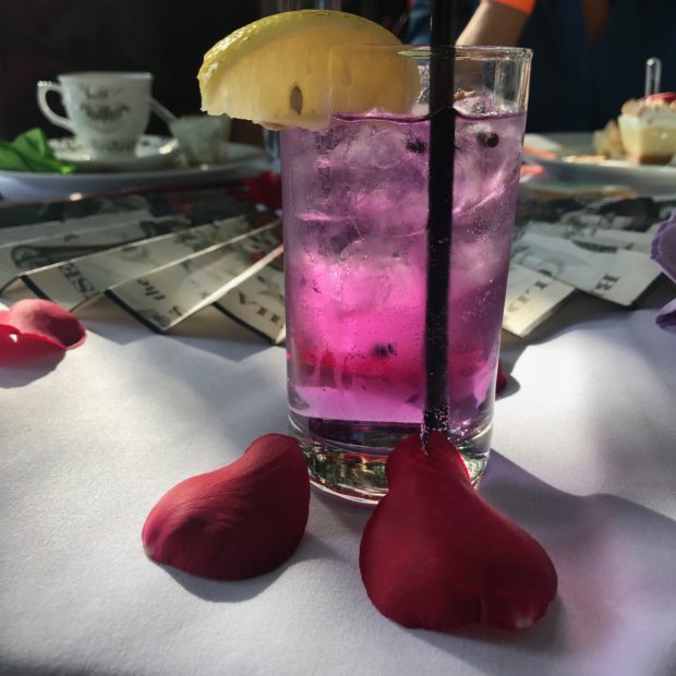 Mad Hatters Gin & Tonic Purple Potion. This pretty little drink is a butterfly pea tea infused with Hendricks gin, seasonal botanicals, tonic water, lemon, and a touch of magic! Part of the magic is that this drink turned purple after adding some lemon to it. It was delightfully tasty and the tea had a nice strong base to go with the gin.
