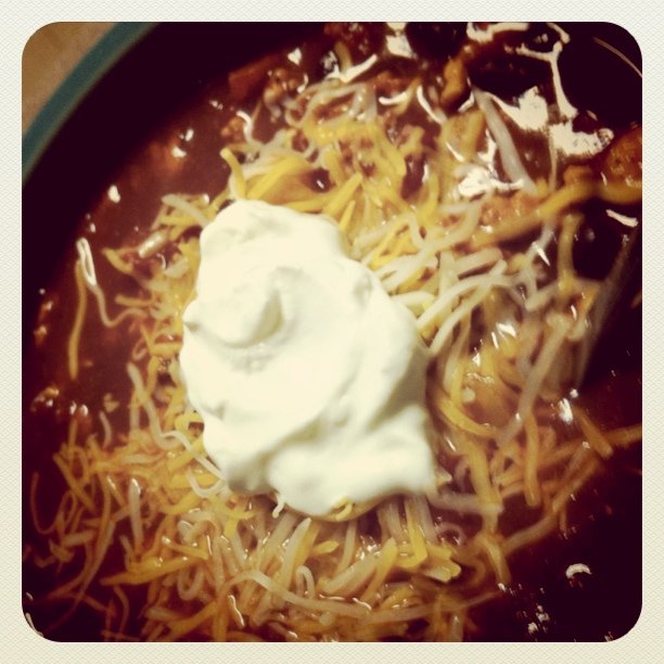 I top my chili with 2% cheese and a little light sour cream, then serve with crackers or baked tortilla chips for a little crunch!