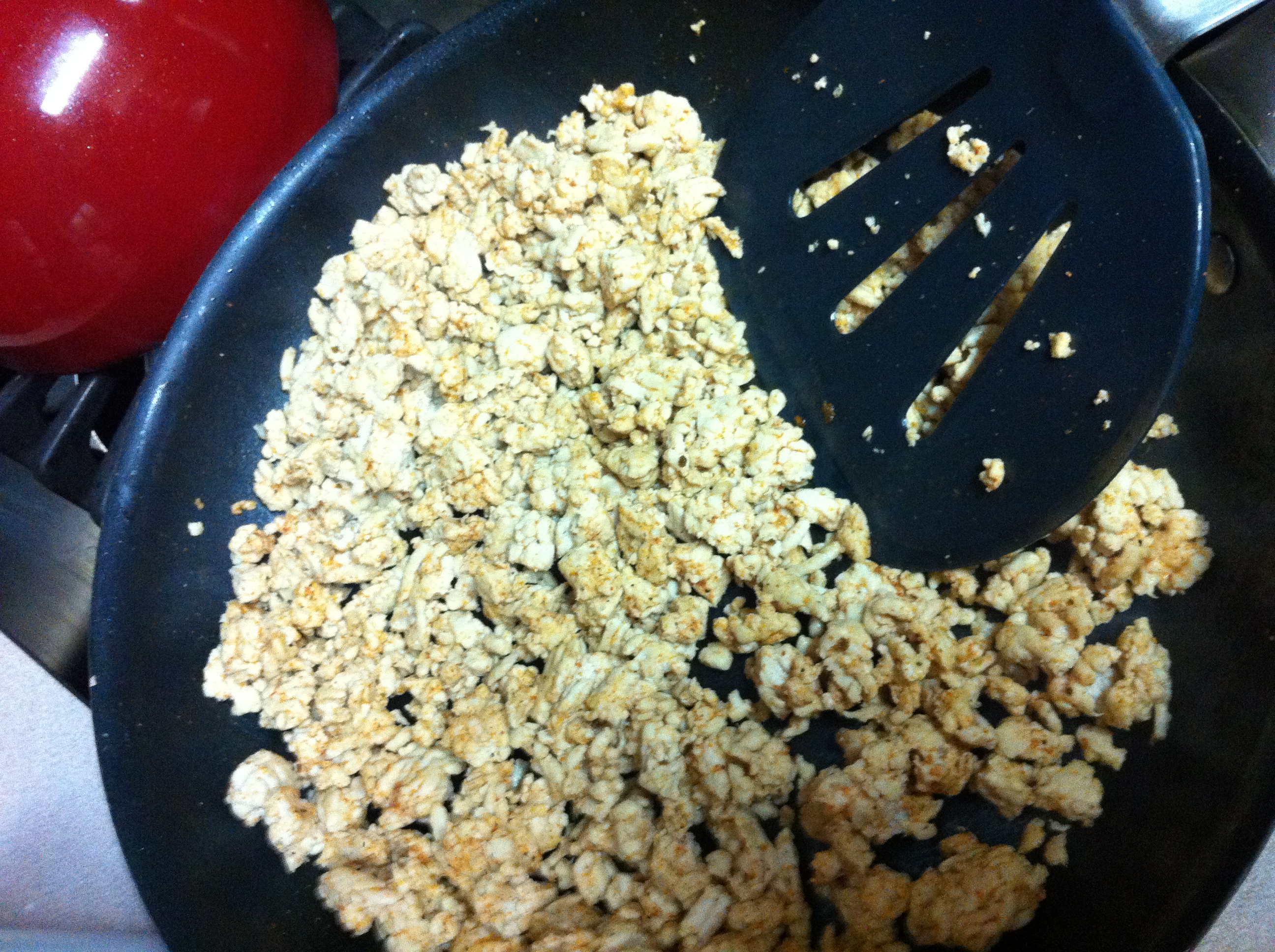 I used the lowest fat turkey available – typically ground turkey breast. Since there’s not a lot of fat in this, I cook it separately in a non-stick frying pan until browned, sprinkling with blackening seasoning to add in some extra flavor. If I don’t have blackening seasoning, I use taco seasoning and a little pepper.